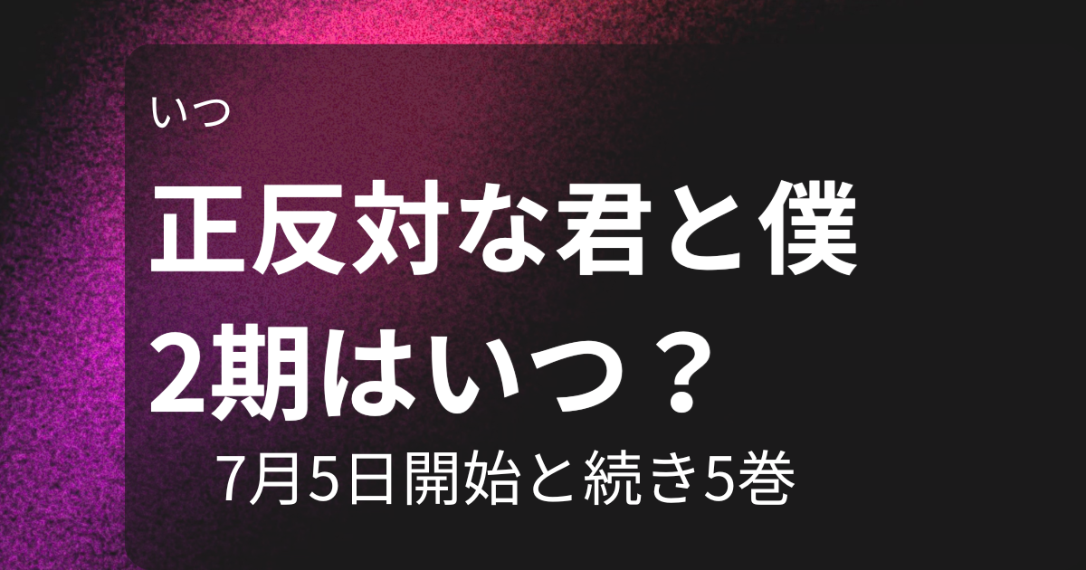 結論からいうと、『正反対な君と僕』2期は2026年7月5日(日)から始まります。 地上波はMBS/TBS系全国28局ネットで毎週日曜17:00から放送です。 ABEMAとPrime Videoでは、毎週日曜17:30から最速配信されます。 さらに、第1期の続きが気になる人は原作5巻か... -