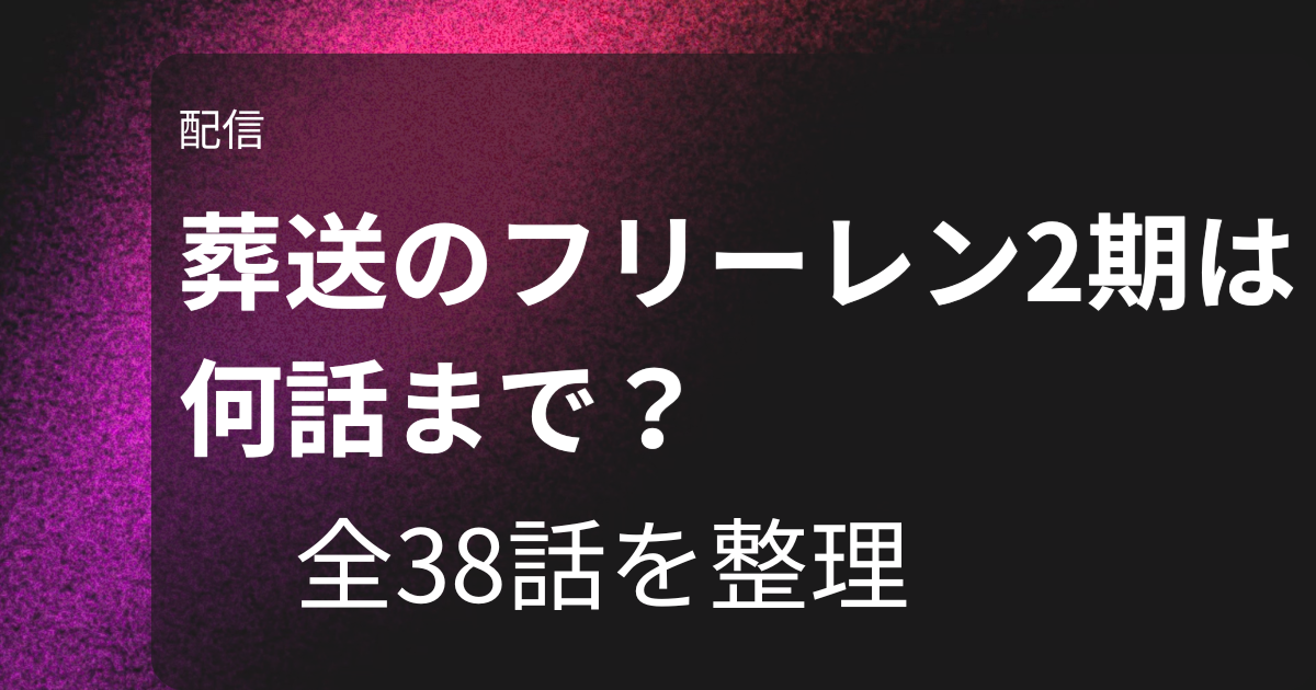 結論からいうと、葬送のフリーレン第2期は第29話「じゃあ行こうか」から始まり、第38話「美しい光景」で終わる全10話です。 つまり、第2期だけで見れば全10話、第1期から通して見ると全38話になります。 第3期に向けて押さえるなら、第38話まで見ておけばO... -